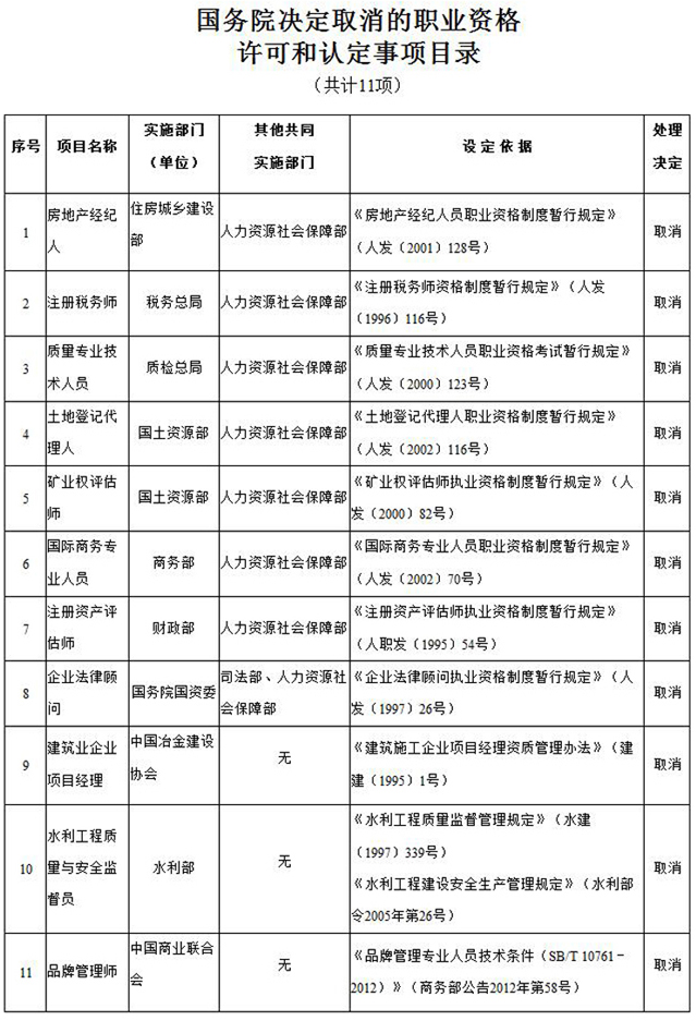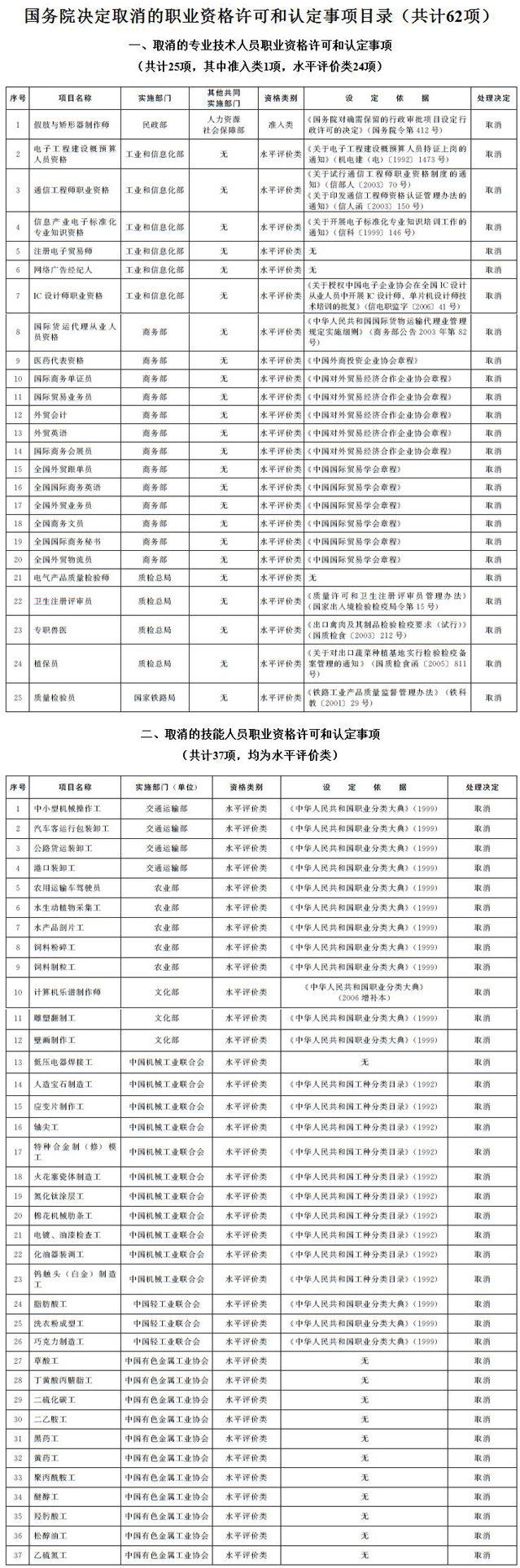 相关文件:国务院关于取消一批职业资格许可和认定事项的决定(国发〔2015〕41号)