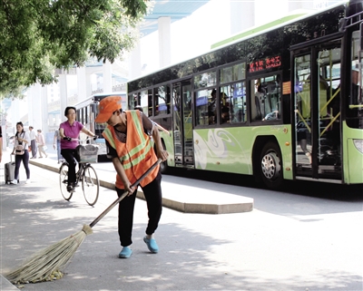 烈日下环卫工人在清洁马路