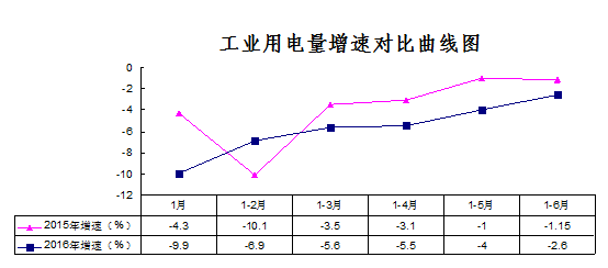 其中第一产业用电量完成1.88亿千瓦时,同比下降6.7%(主要是今年降雨量比去年同期偏多,农业灌溉用电同比下降20.1%);第二产业用电量完成45.05亿千瓦时,同比下降2.5%,其中工业用电量累计完成44.9亿千瓦时,同比下降2.6%(主要是由于神华煤焦化用电量同比下降60.1%,包钢煤焦化下降25.4%,联邦制药下降19.5%,乌拉山化肥厂下降17%,铁合金、电石等高载能企业下降5.6%),但降幅较一季度、1-4月份、1-5月份分别收窄3、1.9和1.4个百分点,5月、6月当月用电量同比分别增长1.3%和3.7%,连续2个月度实现正增长;第三产业用电量完成3.91亿千瓦时,同比下降5.2%(主要是租赁和商务服务业用电量同比下降48.2%,邮政业下降28.2%,房地产业下降20.6%);城乡居民生活用电4.2亿千瓦时,同比增长5.7%。