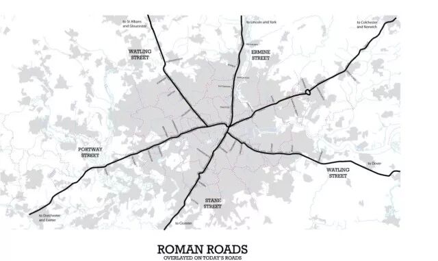 图5 伦敦城市布局中的6条呈放射线形态的道路