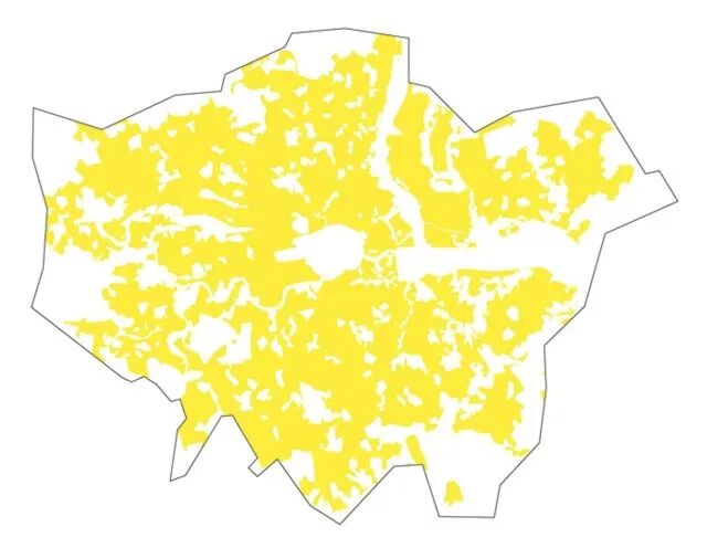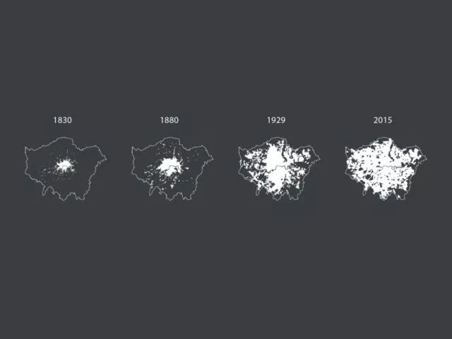 伦敦现有的城市肌理已扩张吸收了许多城镇和乡村。除了中心区,城市其他区域一般均为两、三层的楼房。