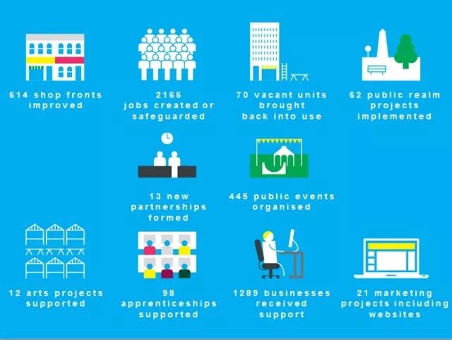 这段时期由政府提供资助的与工作、学习或户外活动相关的项目遍布伦敦各地,包括改善了614间商店的外立面、提供或保留了2166个工作岗位、活化利用了70个空置场所、建设了62个公共场所、组织了445项公共活动、打造了13个合作伙伴关系、支持了12个艺术项目和98个实习课程、赞助了1289个商务项目以及21个营销项目(包括网站)。